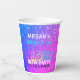 Trendy neon glow in the dark pink blue neo vibrant glitter colourful Sweet Sixteen party personalized paper cups.