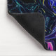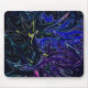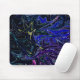 Digital art design creates this unique neon blue, pink, purple and yellow design on a black background.