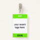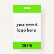 Customize this bright neon green volunteer event crew staff badge with your logo. If your logo is square, it will fill up the white space entirely. If your logo is not square, it will show on a neon yellow background. The back of this badge can be personalized with the event name and date or year, or you can delete both to have an all dayglow green back. This simple, minimalist crew staff badge is ideal for special events, festivals, concerts and conventions.