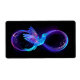 Glowing, purple infinity symbol with flying, luminous, blue hummingbird on black background. Neon.