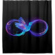 Glowing, purple infinity symbol with flying, luminous, blue hummingbird on black background. Neon.