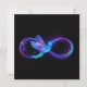 Glowing, purple infinity symbol with flying, luminous, blue hummingbird on black background. Neon.