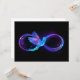 Glowing, purple infinity symbol with flying, luminous, blue hummingbird on black background. Neon.