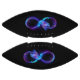 Glowing, purple infinity symbol with flying, luminous, blue hummingbird on black background. Neon.
