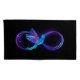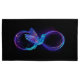 Glowing, purple infinity symbol with flying, luminous, blue hummingbird on black background. Neon.