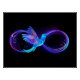 Glowing, purple infinity symbol with flying, luminous, blue hummingbird on black background. Neon.