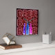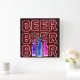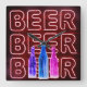 Square wall clock printed with neon look bar sign. The design has coloured beer bottles and is lettered with the word BEER in LED strip lighting. It has a colour palette of red, pink, blue and purple. Please browse our store for alternative colorways.