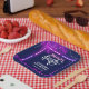 Purple and navy beach party birthday paper plate with the neon frame, palm trees and string lights.
