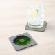Ce magnifique dessous de verre de liège présente une photo d'une fleur de marigold manipulée pour créer une belle fleur de néon avec un centre rouge et vert vif entouré de pétales aux subtiles nuances de jaune, vert et bleu. La fleur est posée sur un arrière - plan gris ardoise pour mettre en valeur le centre lumineux et créer une atmosphère moody.