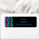 These return address labels have a mid-century modern design of neon pink, green, and blue rounded rectangles in increasing and decreasing size running vertically on a field of black.