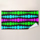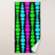 This towel set has a mid-century modern design of neon pink, green, and blue rounded rectangles in increasing and decreasing size running vertically on a field of black.