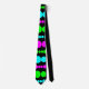 This necktie has a mid-century modern design of neon pink, green, and blue rounded rectangles in increasing and decreasing size running vertically on a field of black.