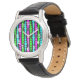This watch has a mid-century modern design of neon pink, green, and blue rounded rectangles in increasing and decreasing size running vertically on a field of black.