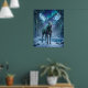 A towering neon moose stands proudly in a futuristic boreal grid forest, crafted from armored fur textures, glowing body lines, and radiant antlers branching like energy networks. Cyan, emerald, silver, and electric blue tones illuminate its massive frame. Digital pine trees, snow-dusted ground, misty air, reflective ice, distant mountains, and northern lights create an epic wilderness atmosphere. This bold woodland design blends strength, nature, and cyber style, ideal for cabins, offices, gaming rooms, and moose lovers.