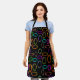 This apron has a geometric design of groups of three ovals in neon colours scattered about on a field of black.