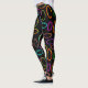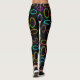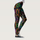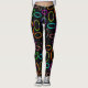 These leggings have a geometric design of groups of three ovals in neon colors scattered about on a field of black.