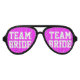 Neon pink Team bride bachelorette party shades. Funny props for soon to be married girls. Fun wedding / marriage accessory for bride to be and entourage; bridesmaids / maid of honour etc. Girls night out / bridal shower party gathering. Cute heart aviator sunglasses with custom personalized text. Customizable frame colour and background colour.