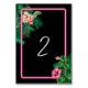 A modern yet retro themed neon pink tropical botanicals on a black background. A beautiful wedding design ideal for summer. Perfect neon pink tropical plants design featuring palm trees, pink Hibiscus flowers and Plumerias Frangipanis flowers. Black, pink, and green colours dominate this tropical pink neon design. The modern calligraphy typography contrast perfectly against the black and pink wedding themed design. A classy elegant wedding table number card design with modern simple elements. Matching wedding stationery items and other wedding invite formats are also available. Customize the number and purchase each tables number individually according to how many table numbers you need.