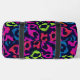 This image showcases a duffel bag featuring a dynamic and playful leopard print pattern. The spots are rendered in vivid neon colours, including bright pink, electric blue, lime green, and vibrant orange, set against a dark, possibly navy or black, background. The texture of the spots appears somewhat textured or distressed, adding to its edgy appeal. Black straps are visible, completing the practical design. This bag makes a bold fashion statement, perfect for adding a pop of colour to any outfit or gym routine.