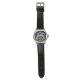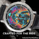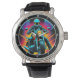 This watch face features a dynamic graphic of a motorcyclist in a helmet, riding a bike against a vibrant backdrop of neon blue, pink, and orange wings or flares. The design has a futuristic, almost comic-book style. White numbers and watch hands are clearly visible, creating a bold and energetic accessory for motorcycle enthusiasts.