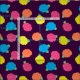 Stylized roses in bright neon pink, blue, yellow, and coral with neon green leaves are spangled across a deep purple background to create a fun floral pattern.