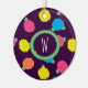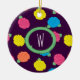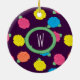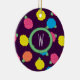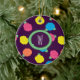 Stylized roses in bright neon pink, blue, yellow, and coral with neon green leaves are spangled across a deep purple background to create a fun floral pattern. Customize the monogram on this ornament with your initial to make it uniquely your own.