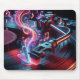 A vibrant neon visualization of music emanates from a turntable's stylus, swirling and rising into the air accompanied by floating musical notes