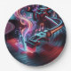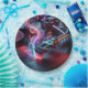 A vibrant neon visualization of music emanates from a turntable's stylus, swirling and rising into the air accompanied by floating musical notes