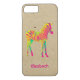 Personalized phone case with a funky, sixties style psychedelic illustration of a baby zebra in neon colours of bright yellow, hot pink and mint green. Wild and fun with a creative artsy flair. Set on a faux craft paper background. Customize with your own name or other text.