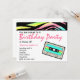 Une invitation inspirée des années 80 à la fête d'anniversaire avec une bordure d'impression zébrée au sommet avec des rayures noires et un arrière - plan d'aérographe des années 80 rose, jaune, bleu et jaune inspiré des années 80. Illustration d'une cassette en bas à droite. Personnalisez le texte rose et noir avec les détails de votre occasion.