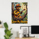 This heartwarming artwork captures a bear dressed in firefighter gear, including a helmet and sunglasses, playing an acoustic guitar while comfortably seated in a bird's nest. Bees fly nearby, and a jar of honey with a small pumpkin rests in the nest. The background features a vibrant forest under a warm sky. The painting's thick, textured strokes add to the endearing quality of the image, with the words "Love My Honey" featured below.