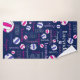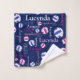 Sporty netballs on a dark blue navy background originally designed personalized name towel set or individual towels. This typographical netball sports-themed patterned towels have white netballs with a pink stripe, and white netballs with a blue stripe, with pink, gray, blue and white text that can be customized with your own name, currently reads Lucynda. Original art and design by Sarah Trett for www.mylittleeden.com