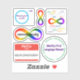 A set of stickers for neurodiverse and neurodivergent people. The designs are: a circle labelled as "neurotypical people" with a dot labelled "me" on the outside, a rainbow infinity symbol to represent neurodiversity, the words "neuro diversity" over a rainbow infinity with each word repeated several times, the word "neurodiversity" over a different rainbow infinity, "Hello I am NEURODIVERGENT" in a nametag style, and "Identity-First Language Please!" with examples of identity-first language in a circle around it.