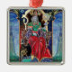 Colourful, vibrant , contemporary painting in gold ,blue,red,green,brown colours . A mysterious hypnotic sorcerer with elegant gorgeous red velvet costumes holding a magic sphere sitting on a gothic throne with gargoyles and an owl. Ambient is surreal,fantastic ,alchemic where you see a jester is drinking from a cup, a templar monk flying on a frog,transparent bubbles,fantasy landscapes with hell fire,cosmic blue sky with stars , mountains of heaven,trees .Egg Tempera on wooden panel with golden foil. 1989 , Miniature Made with pictorical techniques of 1300 by Alessandro Lumini (c) It is also a beautiful fantasy design for Christmas,Holiday,Birthday,New Year's Eve day, Mardi Gras and Carnival greetings.
