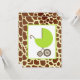 A baby shower invitation featuring an illustration of a green baby carriage over a background of giraffe print. Personalize the text on back with details of your occasion.