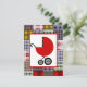 A neutral unisex baby shower invitation featuring an illustration of a red baby carriage over a background of preppy plaid patchwork. Personalize the text on back with details of your occasion.
