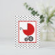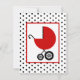 A baby shower invitation featuring an illustration of a red baby carriage over a background of black with white polka dots. Personalize the text on back with details of your occasion.