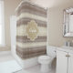 A neutral brown knit pattern shower curtain with lacy tan stripes that you can personalize by adding your name and monogrammed initial to. This is part of the Emperador and Warm Sand Knit Collection. Flat printed image NOT made with yarn or lace.