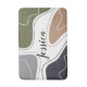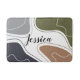 Personalized bath mat with a trendy neutral tone colors gray, green, blue and beige modern abstract geometrical shapes pattern and a personalized name print in the center. Matching shower curtain available.