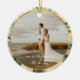 Our first Christmas as Mr. & Mrs. with beautiful neutral champagne beige floral and round golden frame, photo Christmas ornament. Back of ornament features matching floral arrangement on emerald green color background.