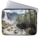 This photo features late winter at Nevada Falls is in full flow and the water thunders off the cliff face and takes up again in the merced river as it passes rocks and fir trees.