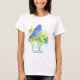 A t-shirt decorated with a watercolor painting of a mountain bluebird perched on a sagebrush plant drawn with sepia ink and painted with watercolor. Artwork is inspired by the Nevada State bird and Nevada State flower.