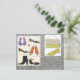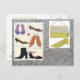 purple,black,brown,chartreuse and red shoes with a matching bag on a white shaggy background. matching mug,note card and postage stamps.
