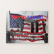 “Never Forget 9 11” in Stars and Stripes with the silhouettes of rescue workers and prayers at ground zero to honour and remember the victims and heroes of September 11, 2001.