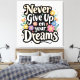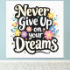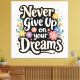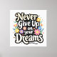 Typography of Never Give Up On Your Dreams surrounded by flowers.