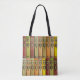 Book shelf patterned tote bag for those who love reading. Colourful children's books on a shelf.