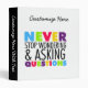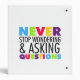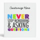Bright multi colour text design reads "Never Stop Wondering and Asking Questions" on inspirational message T-shirts, magnets, buttons, tote bags, cards, stickers, key chains, mousepads, water bottles, and much more. These motivational message items are great for teachers and other educational professionals!