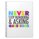 Bright multi colour text design reads "Never Stop Wondering and Asking Questions" on inspirational message T-shirts, magnets, buttons, tote bags, cards, stickers, key chains, mousepads, water bottles, and much more. These motivational message items are great for teachers and other educational professionals!