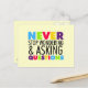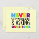 Bright multi colour text design reads "Never Stop Wondering and Asking Questions" on inspirational message T-shirts, magnets, buttons, tote bags, cards, stickers, key chains, mousepads, water bottles, and much more. These motivational message items are great for teachers and other educational professionals!