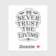 Brighten up your space with the charming "Never Trust the Living" vinyl sticker! Made from premium white vinyl with a sleek finish, this sticker features a kiss-cut border for a clean, polished look.